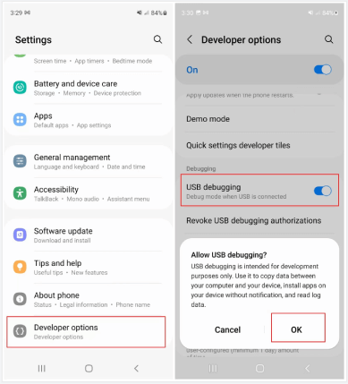Step 2. Navigate to Settings > Developer options on your Android device and enable USB debugging > Connect your Android to your PC using a USB cable.