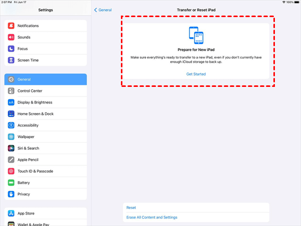On your current iPad, go to Settings > General > Transfer or Reset iPad > under Prepare for New iPad, tap Get Started to create an iCloud backup with the temporary storage.