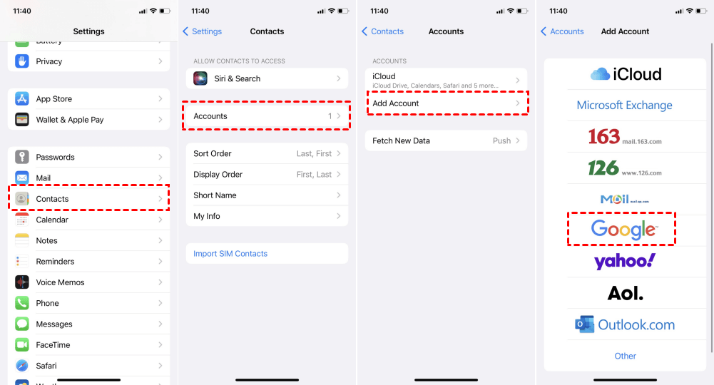 Step 1. Go to Settings on your iPhone > Contacts > Tap Accounts > Tap Add Account.