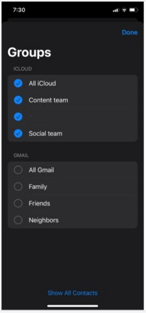 Step 2. Now, go to the Contacts app > Choose Groups from the upper left corner > Select the account you want to move contacts from > Tap Done to continue.