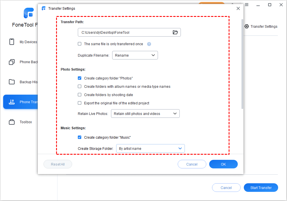 Step 2. Launch FoneTool, choose Phone Transfer > Mouse over to iPhone to PC > Click Start Transfer.