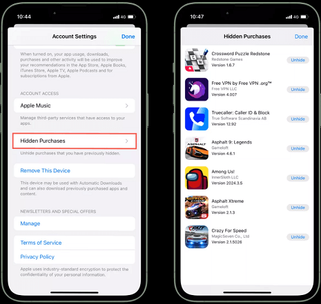 Step 2. Scroll down and tap Hidden Purchases > Select Unhide next to an app to add it back to the App Store purchases page.