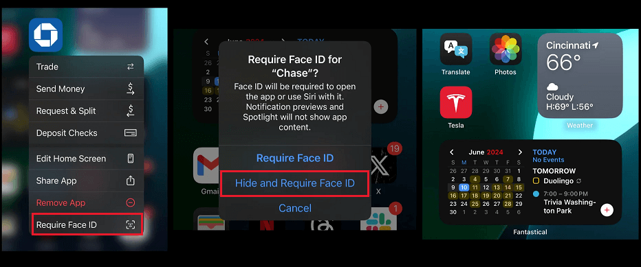 To hide specific apps, long press the app icon you wish to hide > Tap Require Face ID > Choose Hide and Require Face ID to confirm.