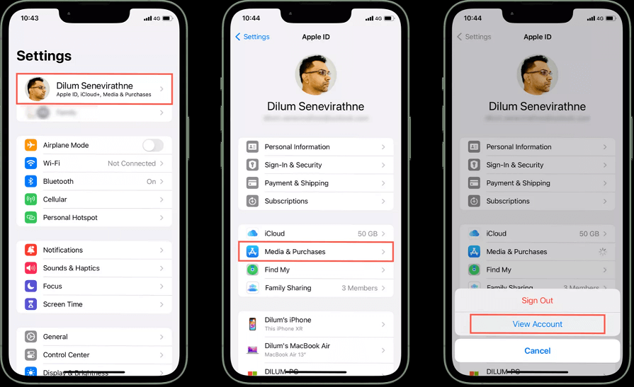 Step 1. Go to your iPhone Settings > Tap [your name] > Tap Media & Purchases > Choose View Account.