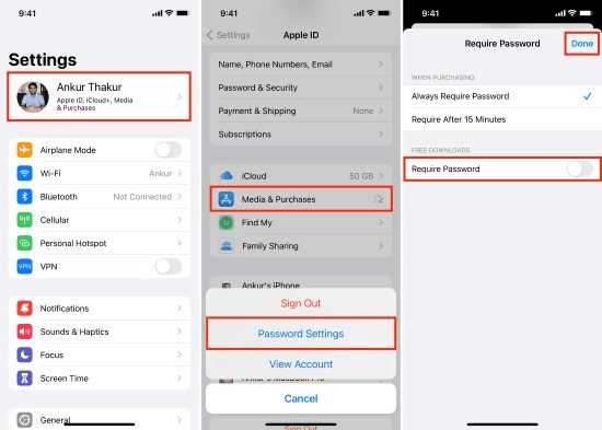 On the Settings app on your iPhone/iPad, tap [your name] > Media & Purchases > Password Settings > Toggle off the switch next to Require Password > Tap Done to confirm.