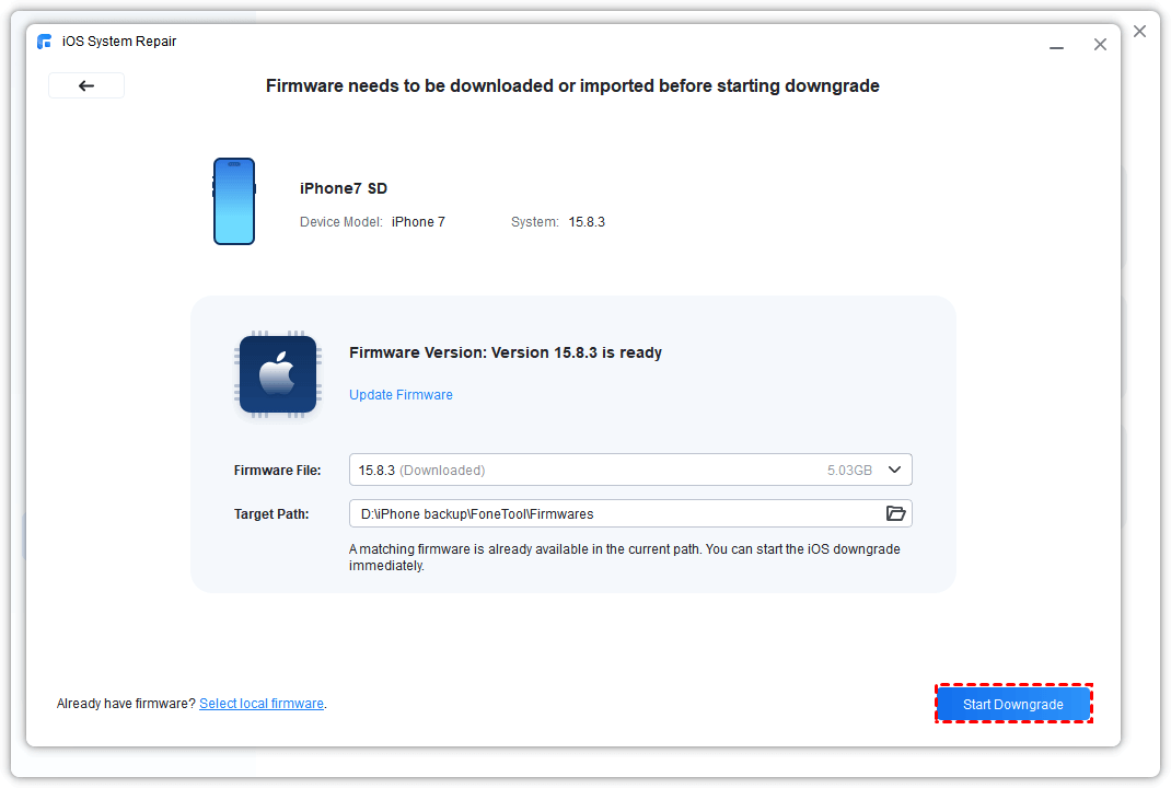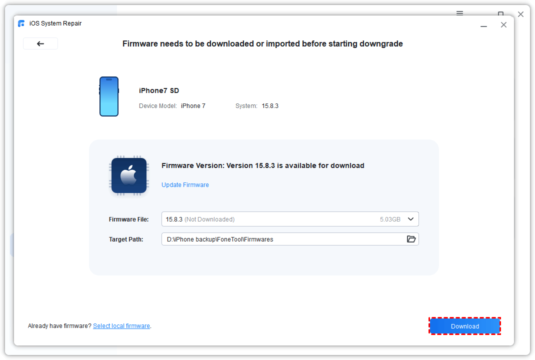 Step 3: Follow the instructions to put your iPhone into Recovery Mode or DFU Mode. The software will detect your device and display available firmware.