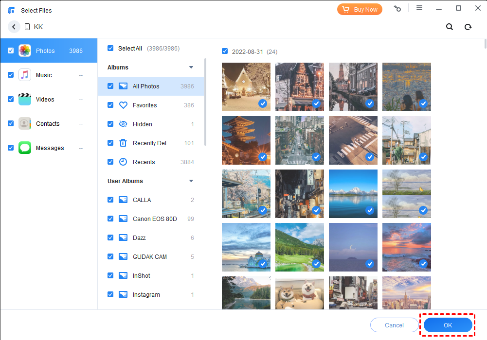 Step 2. Click Phone Backup > Selective Backup. You could preview and select files by clicking an icon to enter Selection. After selecting the needed files, click the OK button to confirm.