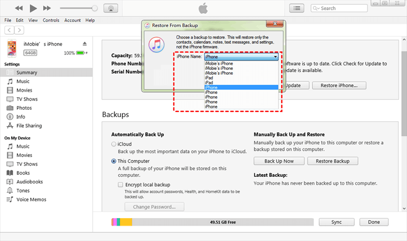 Step 2: Launch iTunes on the PC and click Summary on the left > Then, choose This computer and click Restore Backup.