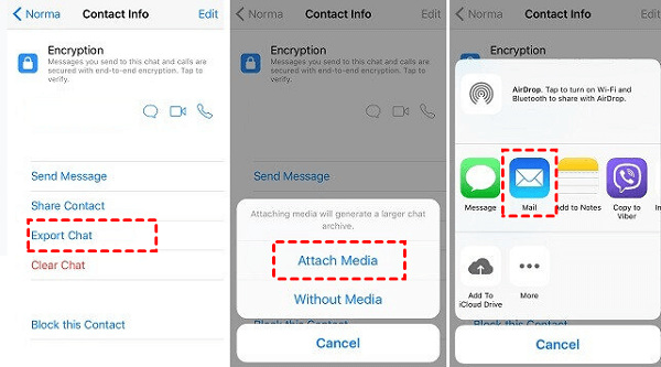 Step 4: Tap NEXT > Choose the chat you want to transfer > Tap Export Chat > Choose Without Media or Attach Media based on your needs > Enter your email address and send it to yourself.