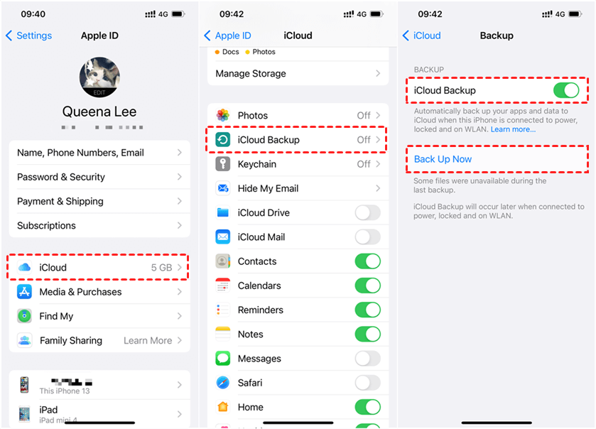 Step 1: Access the Settings app on your old iPhone > Choose iCloud and then iCloud Backup > Enable iCloud Backup and tap Back Up Now.