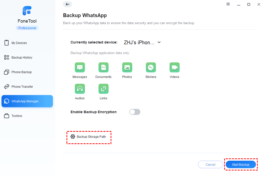 Step 3: Click Backup Storage Path to designate a local storage destination for the backup and then click Start Backup to initiate the backup procedure.
