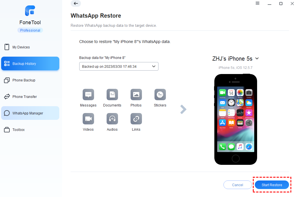 Step 2: Connect your new iPhone to your PC via a USB cable. Then, choose this WhatsApp backup task under WhatsApp Restore > click Start Restore to begin the restore process.