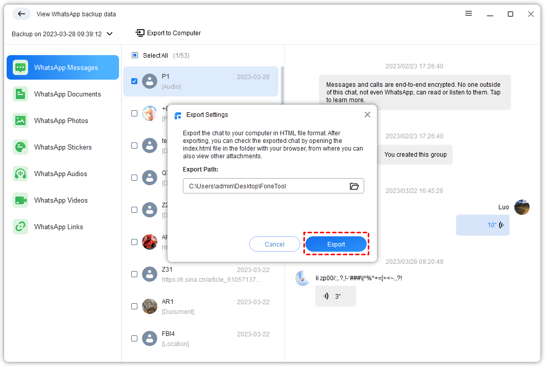 >> If you want to download WhatsApp data from iPhone to PC, just click Export to Computer to save it easily. Then you can choose to export WhatsApp chat to HTML.