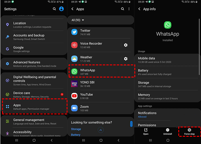 2. Find and choose WhatsApp and then tap the Force stop option.