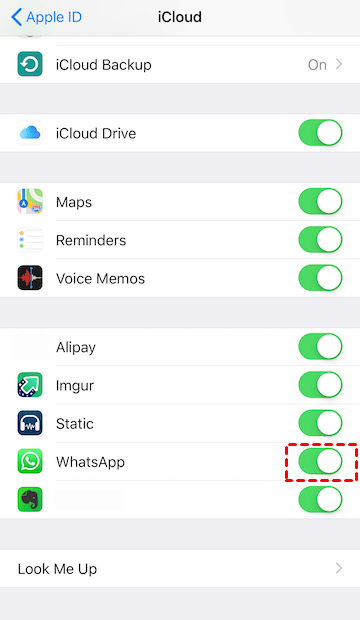 Step 2: Scroll down to find WhatsApp > Tap the switch next to WhatsApp to the green On position to turn on iCloud access.