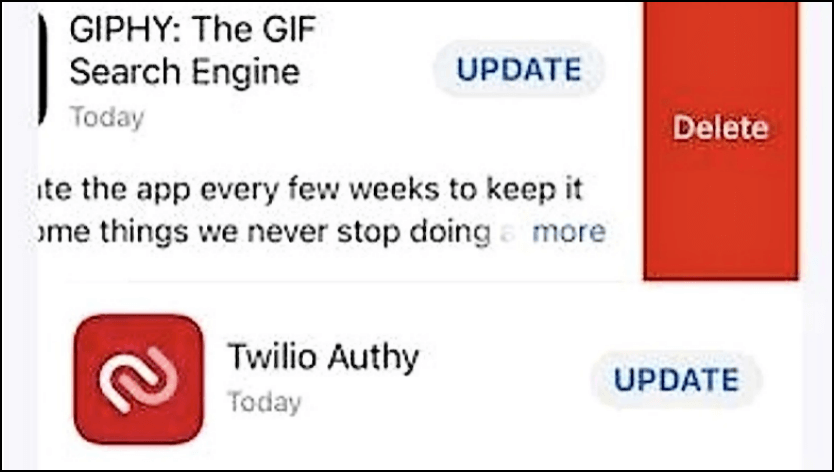 Step 2: Next to each app, you'll see an "Update" option. Swipe left to reveal the "Delete" option. Long-press on that option and select "Delete" to confirm.