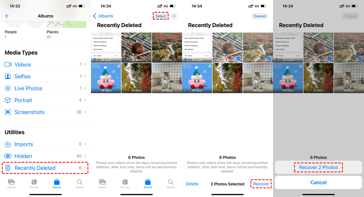 Step 2: Browse through the album to locate the photos you want to recover > Select the desired photos and tap Recover to restore them.