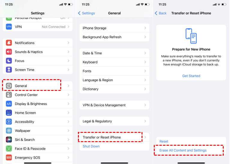 In order to continue, you must clear all data from your iPhone to make room for the backup file. If you have made a full iPhone backup, you can go to Settings > General. From there, select Transfer or Reset iPhone and proceed to Erase All Content and Settings. Once you’ve completed this step, your iPhone will be restored to a clean state.