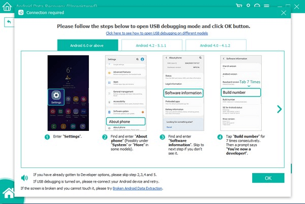 Step 3. Select your broken Android phone’s version from the options, then follow the steps to allow USB Debugging using Developer options.