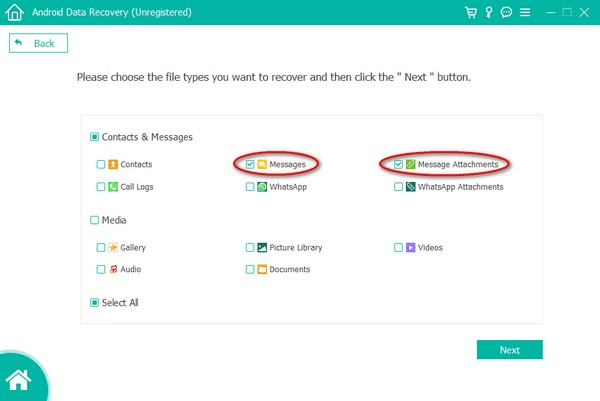 Step 4. Wait for the program to recognize your Android phone, and tick Messages and Message Attachments checkboxes. Click Next to let the tool to scan your Android phone.