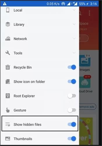 Step 2. Click on the options button > Select Show Hidden Files option.