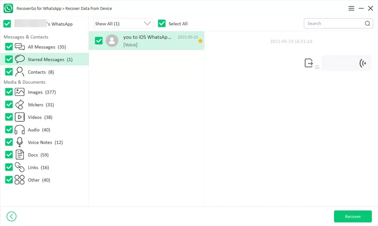 Step 4. Once done, select the deleted WhatsApp status from the given list and click on the Recover button to start recovering the selected status.