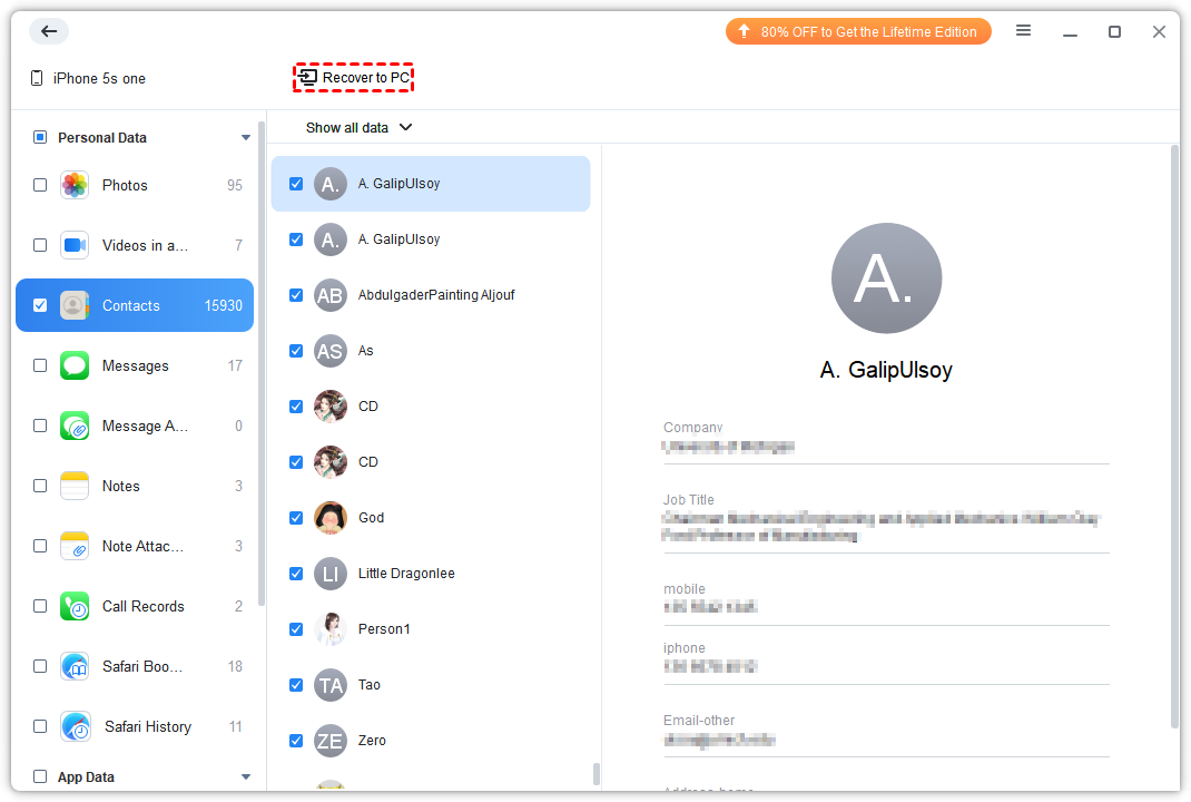 Step 4. From here, you can see all contacts on your iPhone. If there are contacts you need, you can simply choose them and tap Recover to PC to save them on your computer.