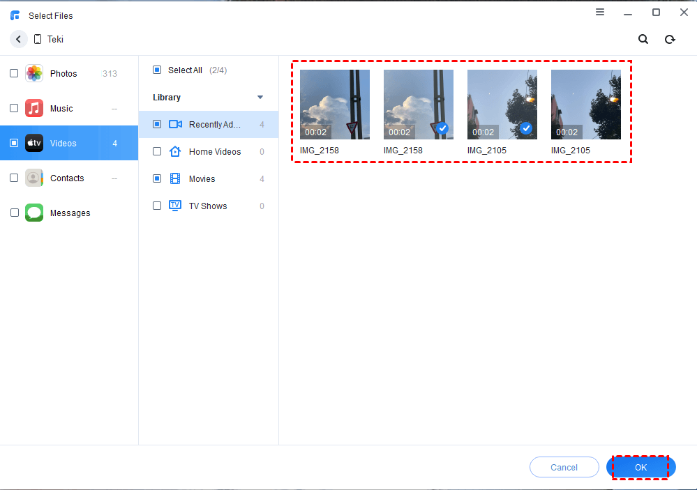 Step 2. Click the Videos icon to preview and select the wanted videos you’d like to backup > Then, click OK to confirm. If you wonder how to backup photos and videos from iPhone to computer at a time, just click Photos icon, too!