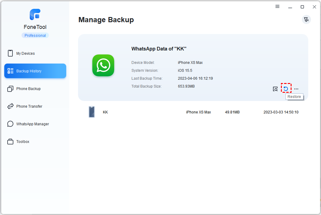 Step 3. To restore WhatsApp messages, click Backup History > Select the WhatsApp messages backup >Click the Restore option.