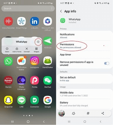 Tap and hold WhatsApp until you see the drop-down menu > Tap i icon > Select Permissions > Make sure the Storage permission is turned ON.