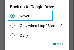 • Choose Chat backup > Tap Back up to Google Drive > From the pop-up menu, choose Never.