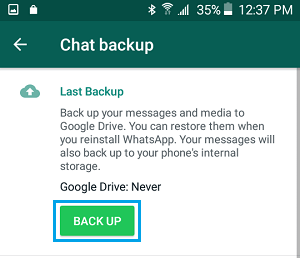 Step 2. Backup WhatsApp to SD card by backing to the Chat backup screen > Tap BACK UP to create a new WhatsApp backup to SD card.