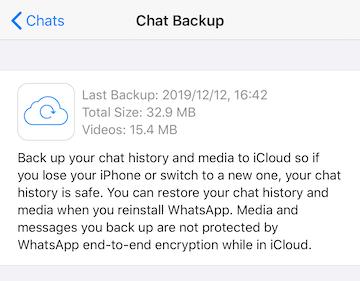 Open WhatsApp on your iPhone > Go to its Settings > Tap Chats > Chat Backup. From here, you can check whether you have the latest backup. Or you can tap Back Up Now to get the latest backup files.