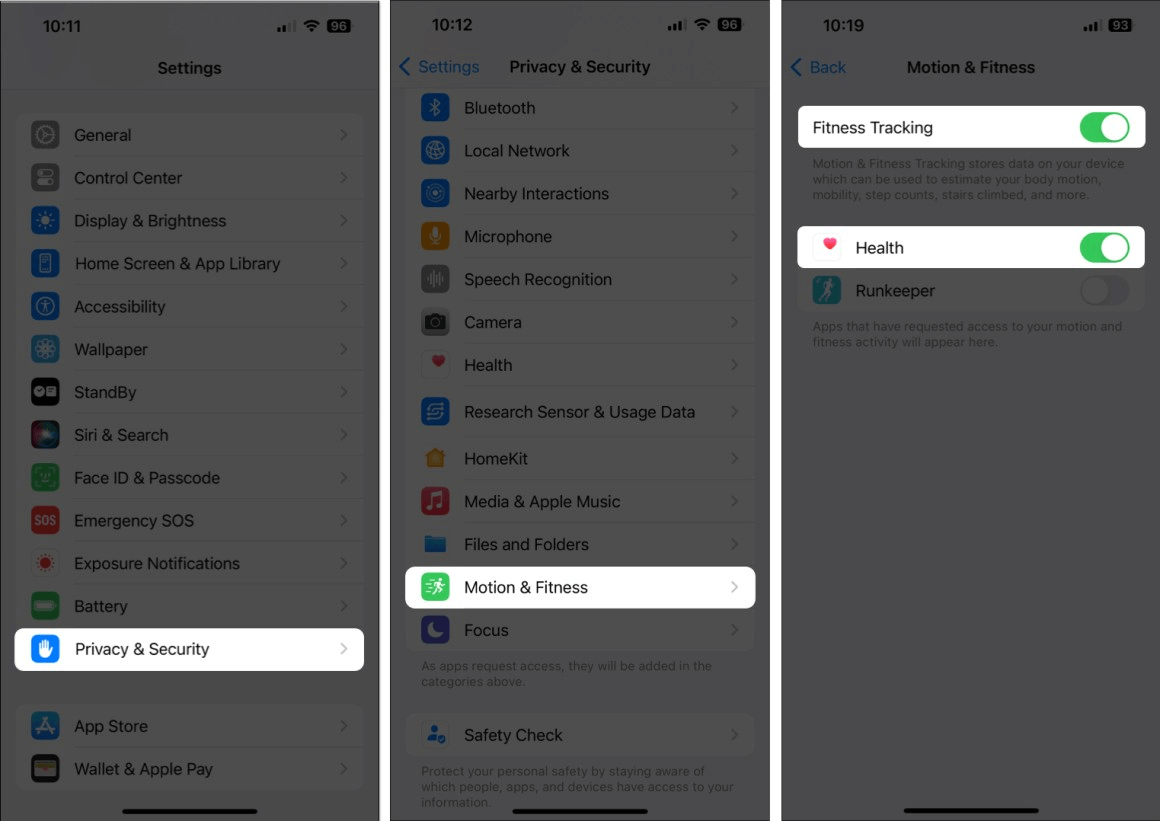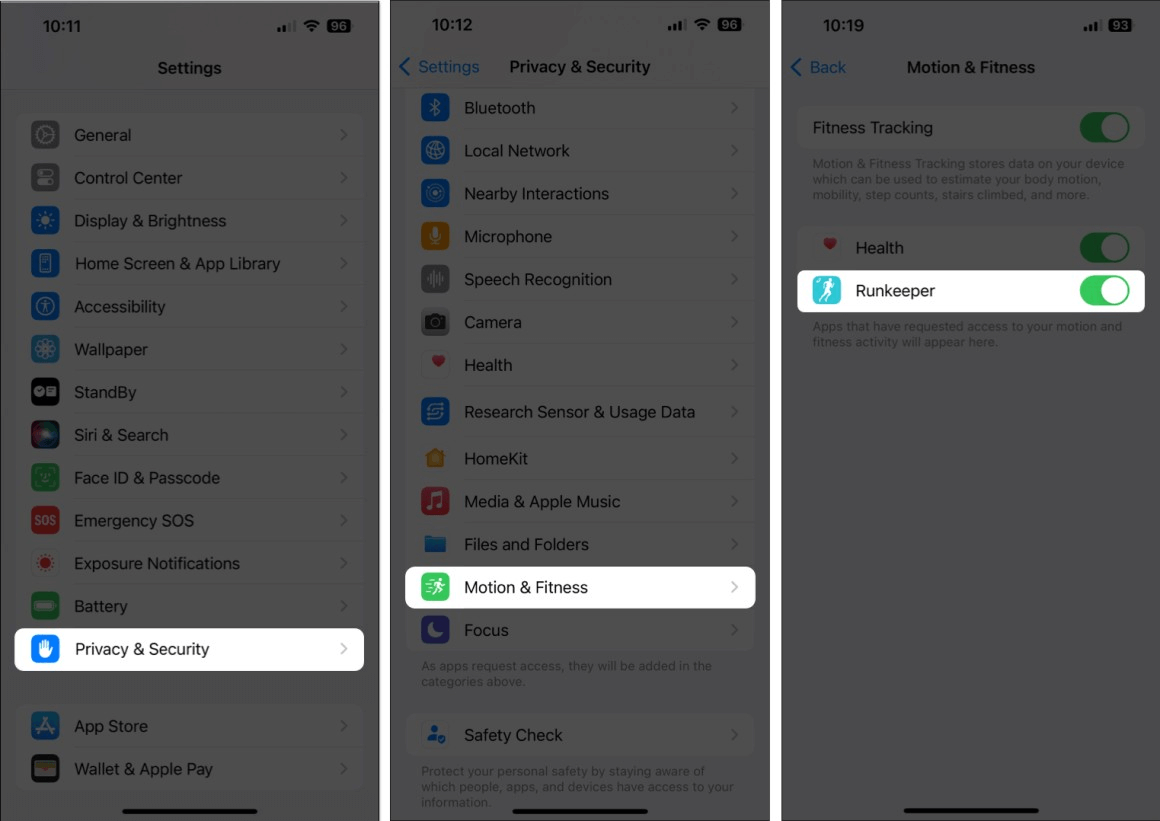 Step 1. Go to the Settings app on your iPhone > Go to Privacy & Security > Motion & Fitness > Check if there are others apps that can access the Fitness tracking data.