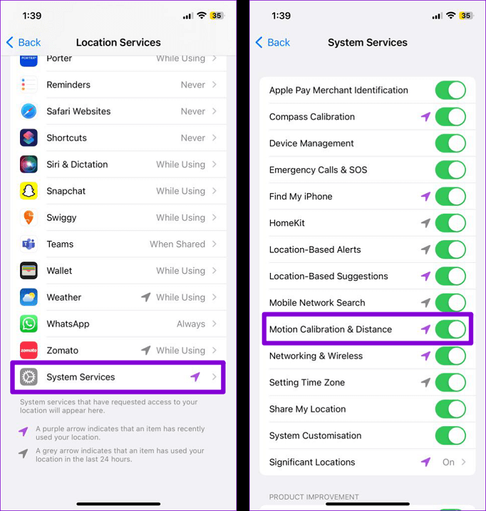 Step 2. Scroll down to select System Services > Enable the toggle next to Motion Calibration & Distance.