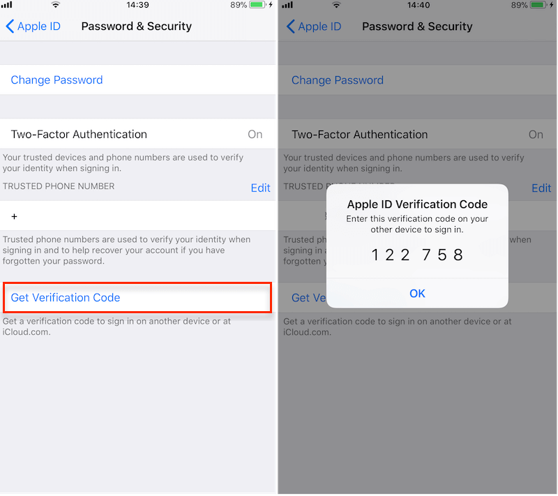 Go to your another iOS device (iPad/iPhone) where your iCloud account is logged in > Launch Settings app on your device > Tap on Apple ID > Find and click Password & Security > Tap on Get Verification Code and click OK.