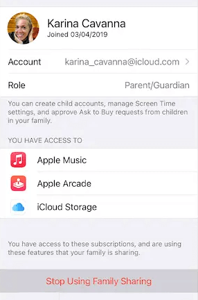 To leave Family Sharing, go to the Settings app > Tap [your name] > Tap Family Sharing > Your name > Tap Stop Using Family Sharing.