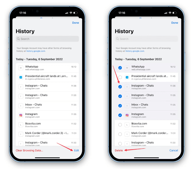 • To clear history of individual websites: Tap Edit in the lower-right corner > Select the websites you want to remove > Tap Delete.