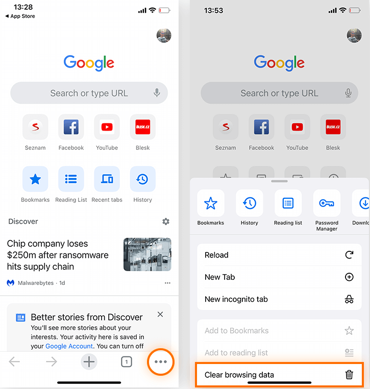 Go to Chrome app on your iPhone > Tap three-dot icon in the lower-right corner > Choose Clear browsing data.