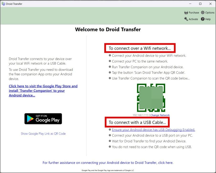 Step 2. Launch Droid Transfer on your PC, choose to connect your Android phone via Wi-Fi or USB cable. We’ll take Wi-Fi method as an example in this guide.