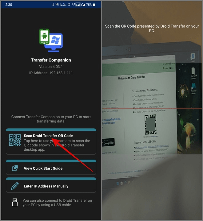 Step 3. Open the Droid Transfer app on your Android phone, select Scan Droid Transfer QR Code > Scan the QR code shown on your computer.