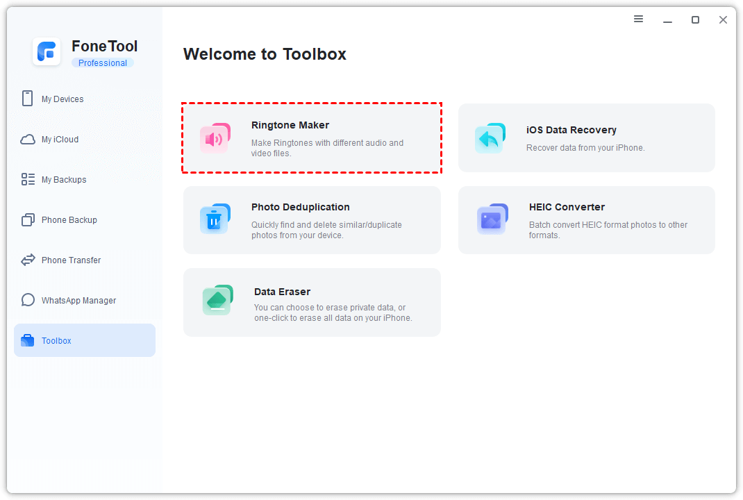 Step 1. Connect your iPhone to the computer via a USB cable > Launch FoneTool > Go to Toolbox > Tap on Ringtone Maker to continue.