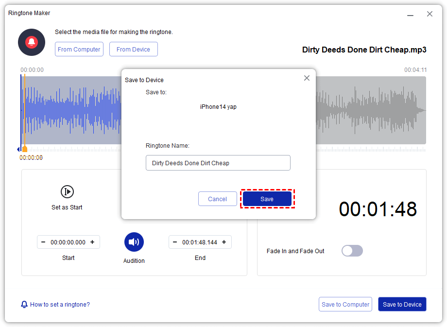 Step 4. Edit the music as you like > Once you have finished the process, tap on Save to Device to save it > Click on Save from the pop-up window to finish the process.