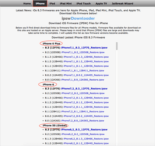 On the Homepage, select the device you want to download for (here we take iPhone as an example) > Select the right ipsw file according to your device model and iOS version > Download it.