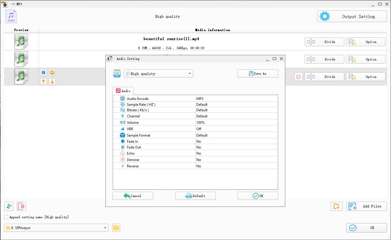 Step 3. In the new window, click the Add Files button to upload the MP4 files you wish to convert. (Optional) Advanced users can click "Output Setting" on the upper right to customize the audio quality.
