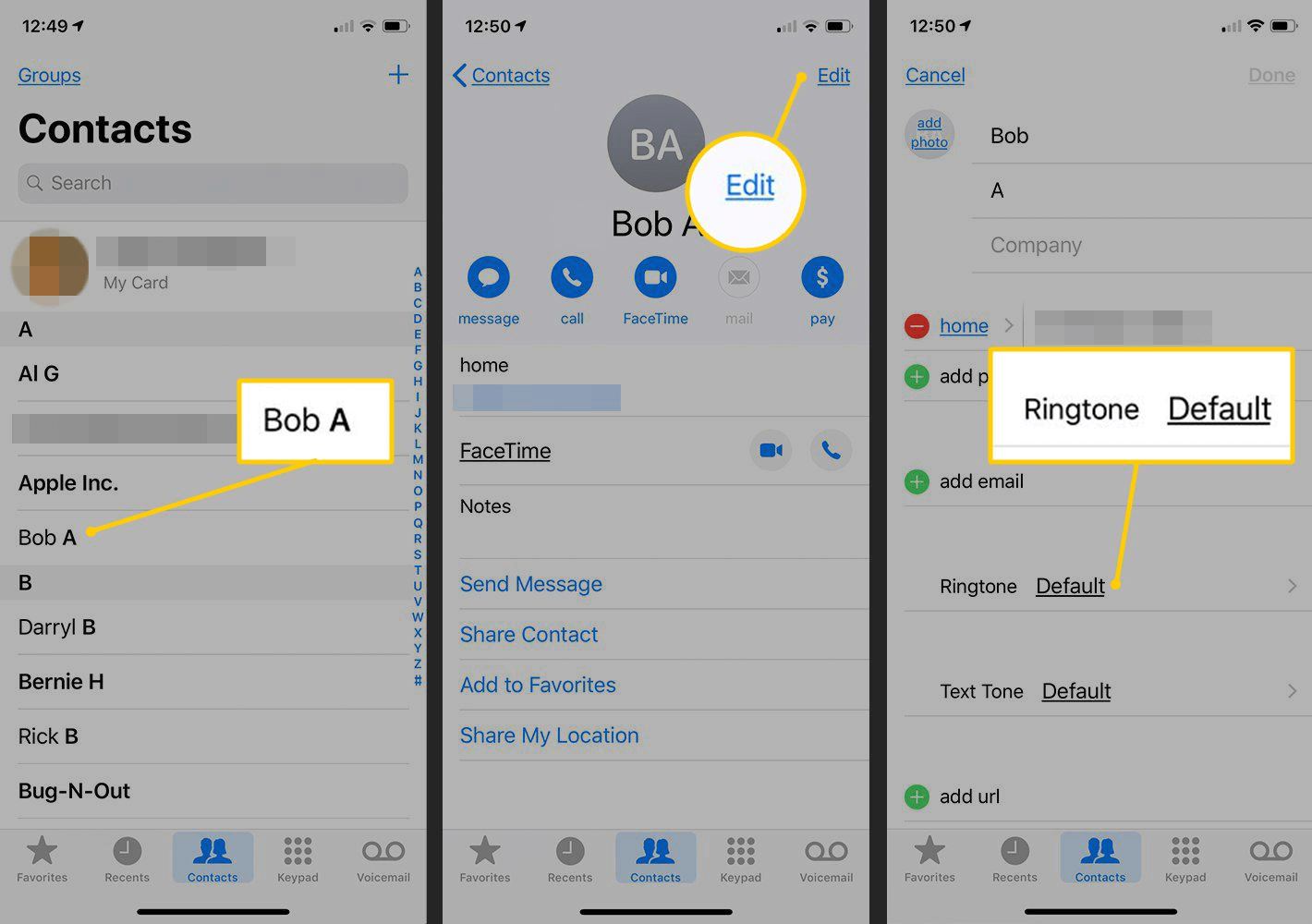 Open the Contacts app and tap the contact you need > In the upper-right corner of the person's contact card, tap Edit. Tap Ringtone or Text Tone, then choose a new sound to set a specific ringtone.