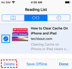 Step 4. Select the web pages that you want to clear > Choose Delete to remove them from the Reading List.