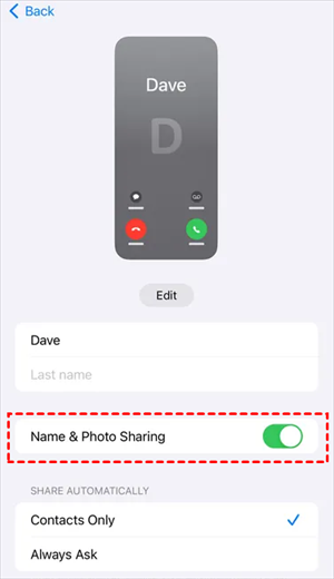 Step 2: Enable the Name & Photo Sharing option and set the contact to Contacts Only.