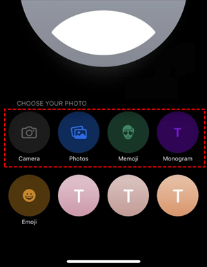 Step 2: At the bottom of the screen, select Camera (for new photos), Photos (for existing photos), Memoji, or Monogram (text) to define the type of contact poster you want to create.