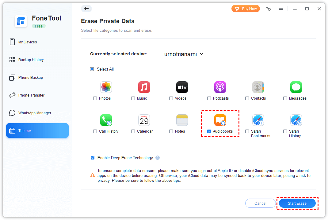 FoneTool offers a robust and reliable solution to securely delete data on your device. You can also use this tool to delete unwanted files on iPhone and iPod. With this advanced software, you can rest easy knowing that your deleted audiobooks and other data are permanently erased and cannot be retrieved.